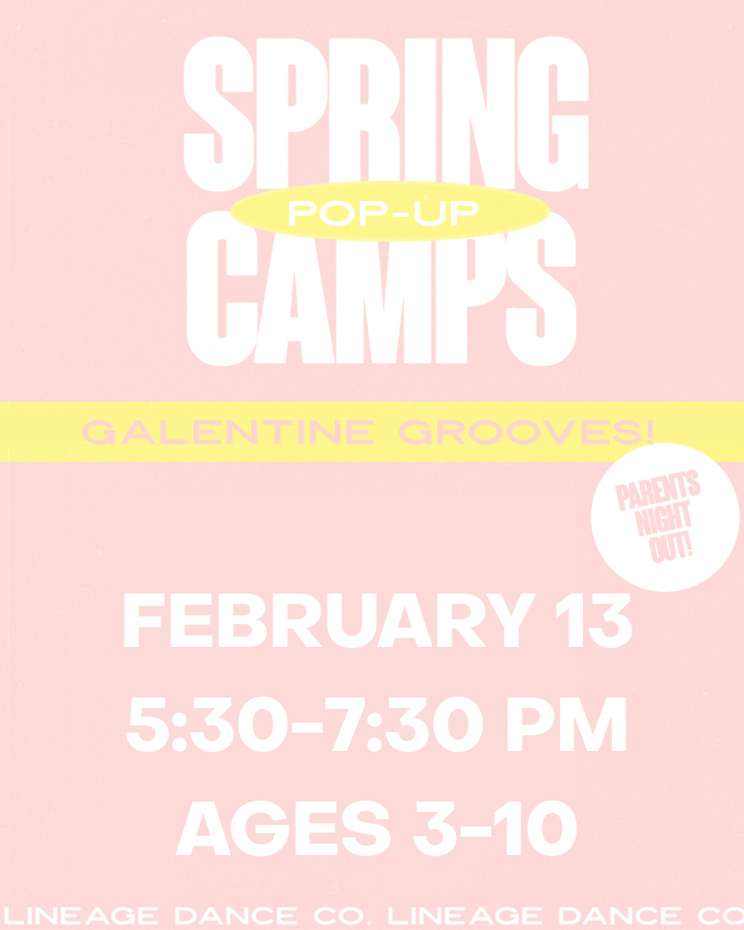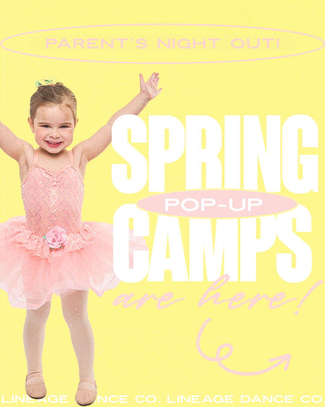 Our spring events include themed Parents’ Night Out experiences and specialty pop-up camps designed to keep dancers engaged, active, and inspired outside of weekly classes.