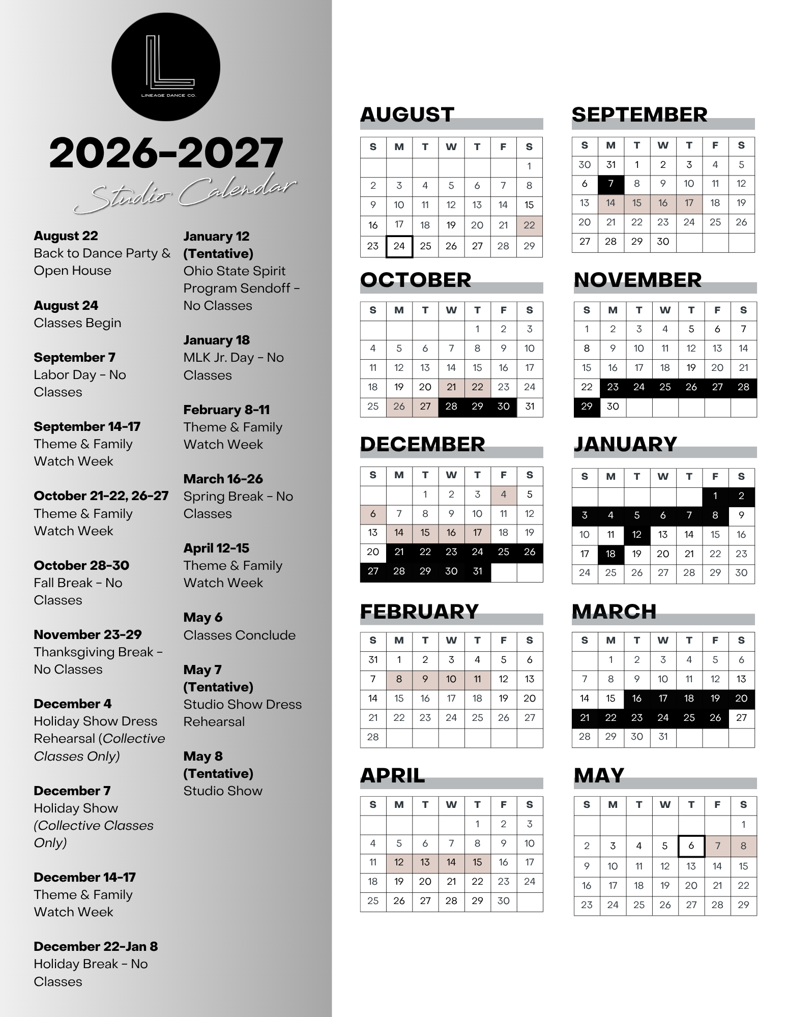 Dancers enroll in classes at the beginning of the season and remain in those classes the entire year! The studio calendar was strategically designed to ensure all classes meet the same amount of times throughout the year. The Studio Calendar can be found below!