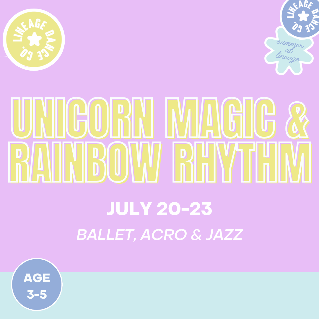 Step into a world of sparkle and enchantment at Unicorn Magic & Rainbow Rhythm Camp. Young dancers will twirl through colorful dance parties, whimsical movement, and fairy tale fun inspired by unicorns and rainbows. Campers will enjoy sparkly dress up, creative crafts, and magical moments throughout the week, including creating their very own affirmation jar to take home. Every step encourages imagination, confidence, and lots of unicorn magic.