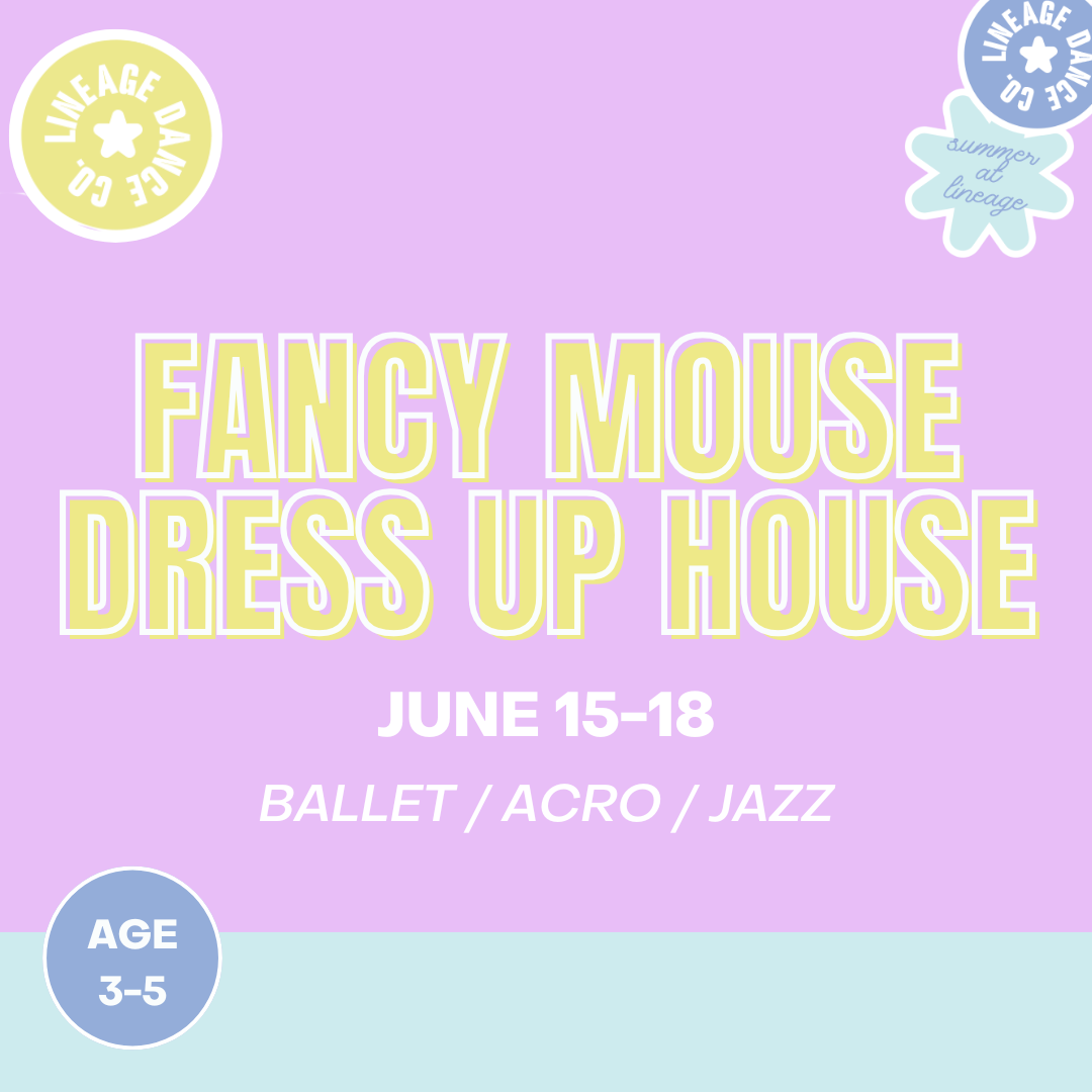 If you love fun and fancy galore, grab your favorite mouse ears and join us at the Fancy Mouse Dress-Up House! This fanciful, danciful dance camp will take dancers through the most très, très chic mouse house in all the land.…toasting friends with cupcakes and tea in the dazzling dining room, going all glitz-and-glam, playing dress-up in the massive mouse-inista closet and shimmering under the disco ball at the playroom pizzazz dance party! Filled with the fanciest dancing-est fun and marvelous mouse-tastic crafts. This ballet, acro and jazz camp is perfect for all sassy and classy kids who love Minnie, Mickey, Daisy and friends!