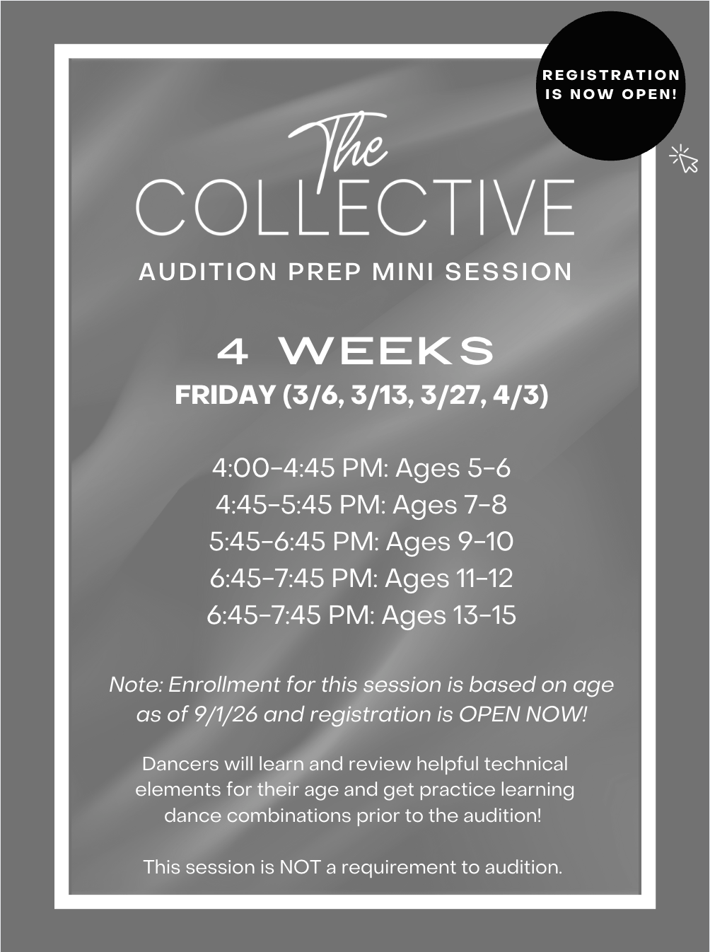 Get ready for auditions with confidence! This focused mini session is designed to help dancers feel prepared, calm, and ready to perform their best when audition week arrives.